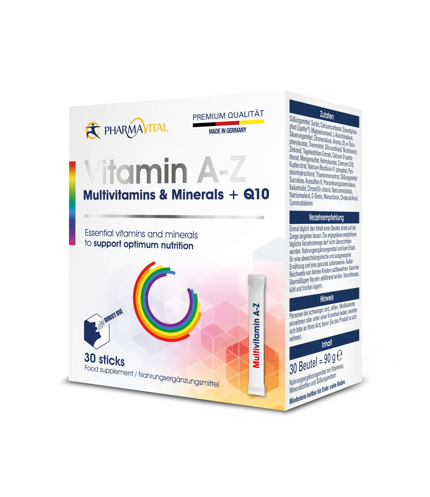 Süßungsmittel (Sorbit, Sucralose, Acesulfam K), Calciumcarbonat, Eisendiphosphat (Lipofer®), Magnesiumoxid, L-Ascorbinsäure, Säuerungsmittel: Zitronensäure, Aroma, DL-α-Tocopherylacetat, Trennmittel: Siliciumdioxid, Nicotinamid, Zinkoxid, Tagetesblüten Extrakt, Calcium-D-pantothenat, Mangansulfat, Retinylacetat, Coenzym Q10, Kupfercitrat, Natrium-Riboflavin-5’-phosphat, Pyridoxinhydrochlorid, Thiaminmononitrat, Pteroylmonoglutaminsäure, Kaliumiodid, Chromchlorid, Natriummolybdat, Natriumselenit, D-Biotin, Menachinon, Cholecalciferol, Cyanocobalamin.